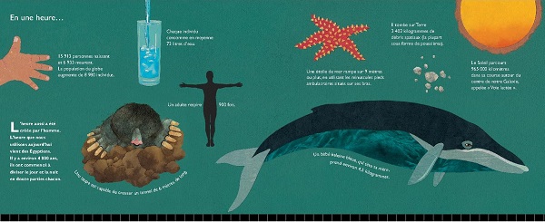 Ah tiens, j’allais oublier de préciser ce qu’on ne peut pas faire en une heure, quand on partage la vie d’une fille plongée dans cet album : relire une phrase de Proust. Cher Auteur, pour les réclamations, adressez vous à Steve Jenkins. Comme il vit aux États-Unis, lesquels s’éloignent de notre bon vieux continent à vue d’œil, bonne chance pour le rattraper.